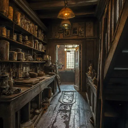 Subtle fractures mar the space. In the Upper Storage Drawer, a ruined batch of tin circles—warped from uneven heating—lies beside an unpaid invoice from a London importer. A folding rule is snapped cleanly at one joint, contradicting his methodical habits. The Guest Chamber reveals a travel coat draped across a chair, pockets weighed with solder sticks and marking chalk, but no other belongings prepared. A lantern frame on the bedside table sits edged but unsoldered, its panels misaligned as though his focus dipped unexpectedly.