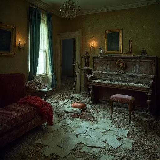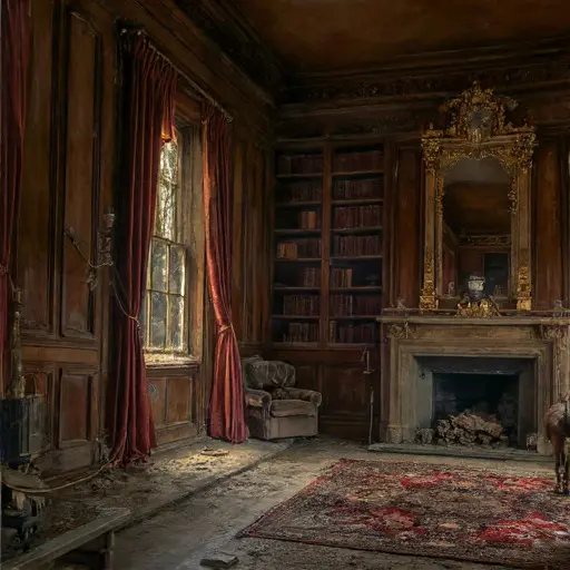The moment I stepped into the front parlor of Verriton Hall, the word forgotten settled like plaster dust in my throat. Time had not merely passed here — it had congealed. The air was heavy with stale perfume and scorched gaslight, the scent of neglect soaked deep into every drape, cushion, and threadbare carpet.