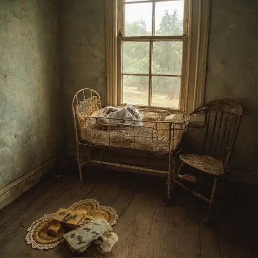 Most telling is the West Nursery, locked from the inside. The door’s brass knob is tarnished black. When opened, it reveals toys scattered mid-play — a porcelain doll with one eye, a rattle shaped like a swan, and a cradle lined with now-yellowed linen. Mold blossoms across the ceiling. The room smells of talcum and rot.