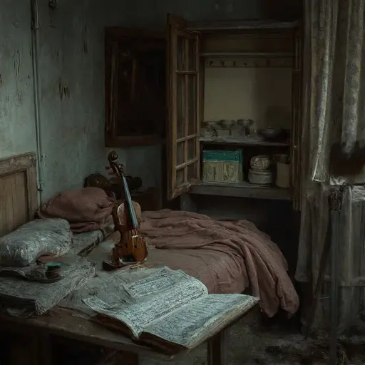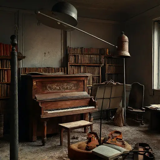 The music room hangs in hushed stillness. On the piano, a half-composed piece rests, its melody lines incomplete. Instruments lie in careful arrangement, keys and strings untouched, as if awaiting the return of their master.