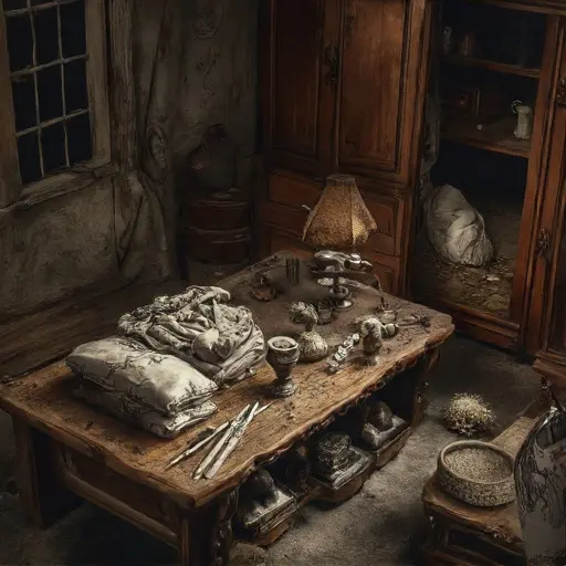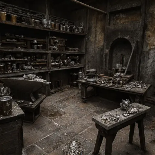 On the main bench, partially completed brooches, goblets, and candlesticks lie scattered. Hammers, files, and tongs are aligned by function. A ledger beneath folded patterns tracks client orders, metal weights, and design steps. Several unfinished pieces lean against the wall, edges rough, suspended mid-creation as though awaiting Seamus’ meticulous hand to continue.