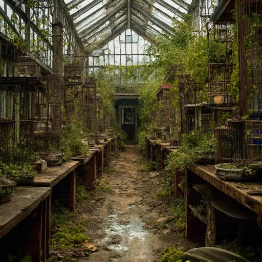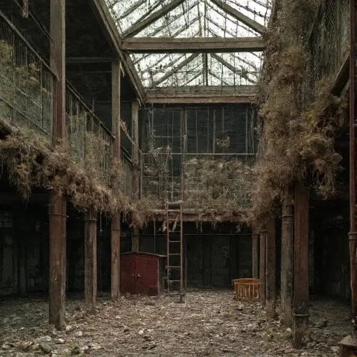 Arbor Vitae Coil is a house that winds back on itself, a labyrinth of interconnected wings built around a central, now-shattered greenhouse. This abandoned Victorian house is singular for its intense, deliberate focus on housing life—not people, but creatures. The atmosphere inside is overwhelmingly damp and earthy, smelling strongly of dried peat moss, old leather, and a faint, acrid scent of abandoned nests. The silence here is unnatural; it is the silence of an empty zoo, creating an eerie sense that the air is heavy with the echo of hundreds of forgotten chirps, clicks, and rustles. The architecture itself feels like a massive, coiled trap.