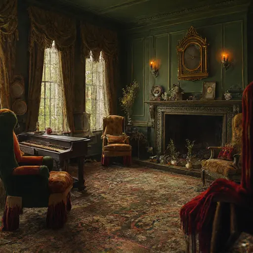 The parlour air is heavy with the scent of time-dulled varnish, old linen, and dried ink. Nothing here speaks of urgency or escape. Mirelatch House sits as though its inhabitants merely stepped away to prepare for tomorrow, unaware that tomorrow would never arrive.