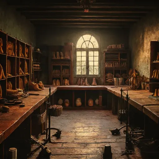The shoemaking parlour exhales into leather-scented quiet, unfinished boots resting in hesitant promise.