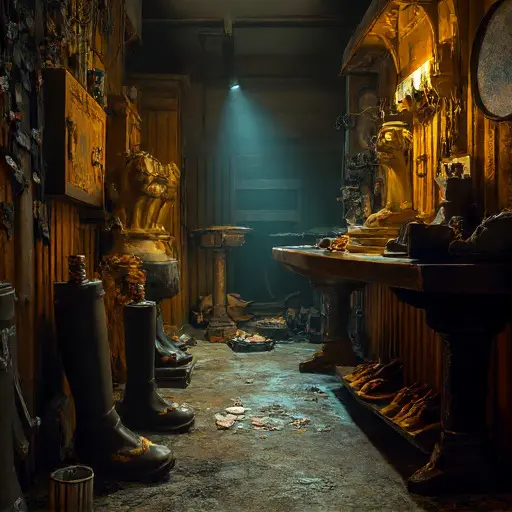 One late evening left its muted signs. A pair of ceremonial boots lies atop a cedar block—toe seams sharp and elegant at the front, while the counters sag and twist at the back. A burnishing bone lies snapped by the handle. A tin of polish has stiffened into dull ridges.