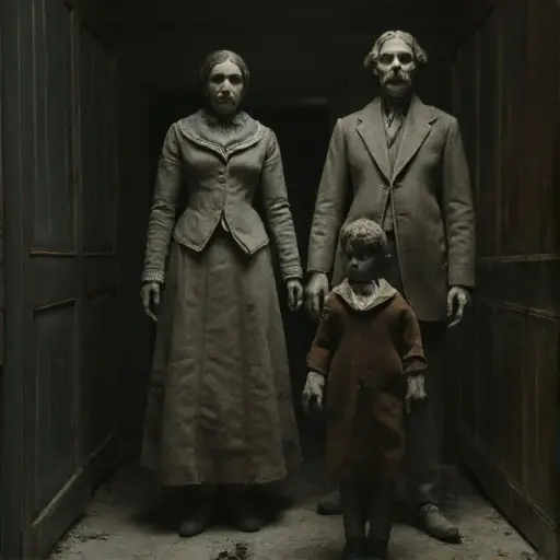 The most chilling discovery was made in the main gallery, where a final, terrifying display was arranged. Standing perfectly still on a raised, velvet-draped dais were the three wax figures. They were flawless, life-like, and unsettlingly serene, dressed in slightly dusty formal attire. Tucked into the inner pocket of the male figure (Dr. Vance’s replica) was a single, small, rolled-up sheet of paper. This was his final note. It revealed the tragic climax: he had finished his replicas, achieved his perfect, non-decaying family. However, during the formulation of the skin-tone wax for the final figure, he was overcome by the chemical vapors, but instead of seeking help, he allowed the process to continue, viewing his death as the ultimate, final sealing and glaze of his creation. His final note read: “The forms are perfect. The life is superfluous. We are now truly beyond the scope of time.” His body was never found. The permanent glaze of Phosgene-Bake Hall is the enduring, cold stillness of the three wax figures, a terrifying testament to an anatomist who substituted the fleeting reality of love with the ultimate, beautiful, and inert artifice, forever preserved within the silent, abandoned Victorian house.}