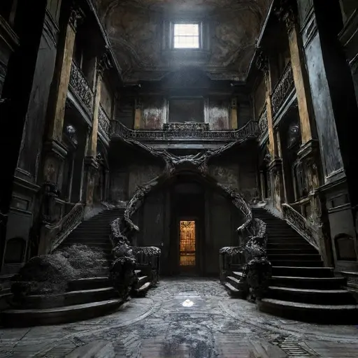 The grand staircase, intended to convey arrival and social importance, is now merely a dusty, monumental barrier. Dust, the primary historical agent here, lies so thick that it absorbs sound, enforcing the profound quiet that has held the house captive for over ninety years, a silence born not of peace, but of utter withdrawal.