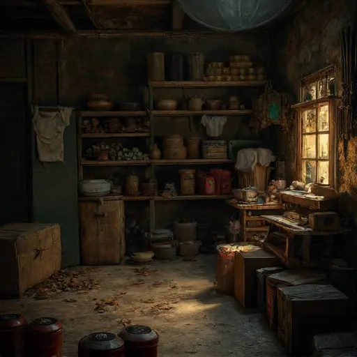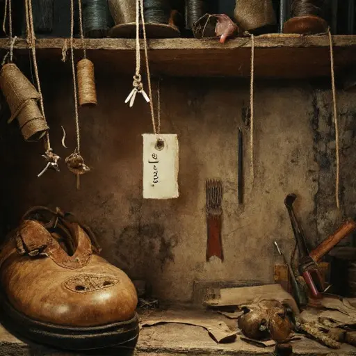 Behind stacked linen lies a returned slip—“irregular fit.” A half-shaped heel cup shows strain marks where the leather stretched unevenly. The stool stands nudged from its usual place, as though Rafael paced the narrow chamber seeking steadier movement. His awl, typically sharpened to a fine taper, bears a wavering grind along one side, hinting at hands troubled by creeping stiffness.