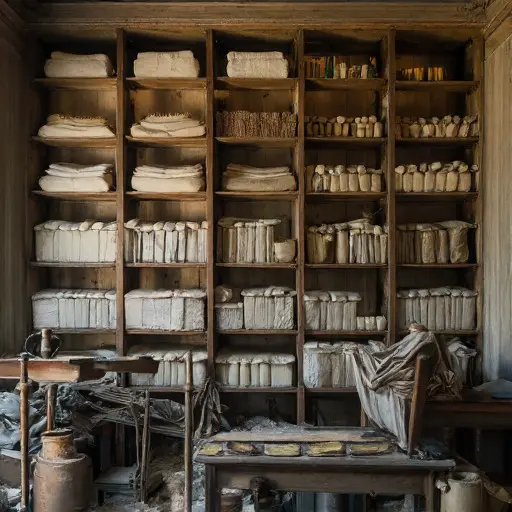 The linen press chamber holds a murmured warmth scented with tallow and old cotton. Light clings to seams and buckles, revealing a stillness sharpened at the edges—one of interrupted care, as though a routine once certain slipped between breaths.