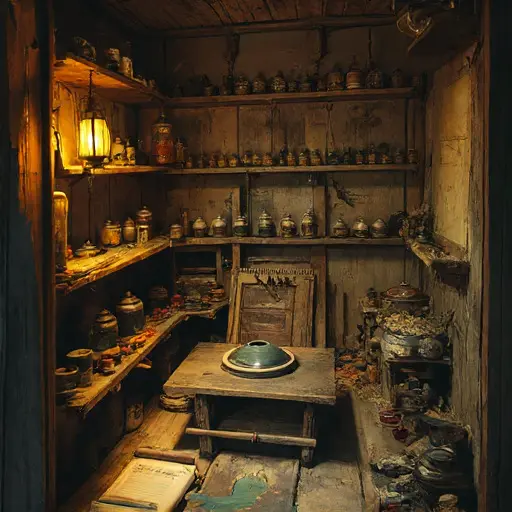 A set of brushes lies fanned beside a shallow bowl, bristles stiff from incomplete washing. Along the banister, scrolls display disciplined strokes, though one character’s structure tilts shy of balance. A porcelain dropper, hairline-cracked, rests near a pile of practice sheets bearing faint red seals. The planks creak softly as though still warmed by steady footfalls climbing and descending in thoughtful rhythm.