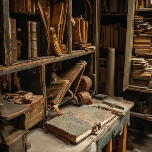 The binding closet exhales a faint scent of hide glue and damp board. Lanternlight settles over tools arranged with painful care, as if someone tried to hold steadiness long after steadiness began slipping away.