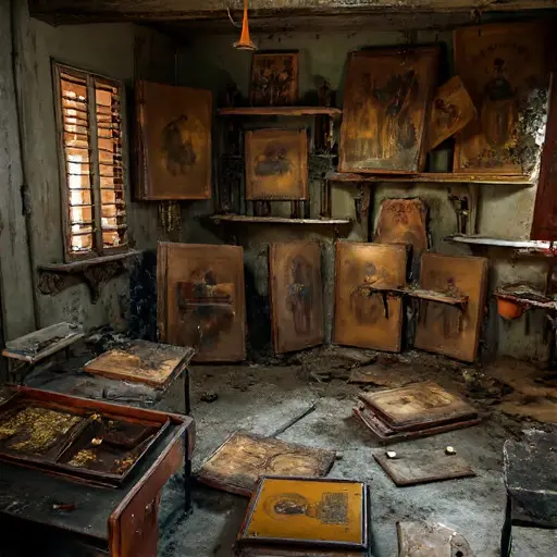 The icon studio hangs in hushed stillness. On the central easel, a half-painted icon leans against a support, its layer notes incomplete. Brushes and palettes lie untouched; gold leaf flakes and pigment dust mark where meticulous work stopped abruptly, leaving the studio suspended in time.
