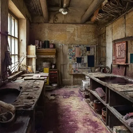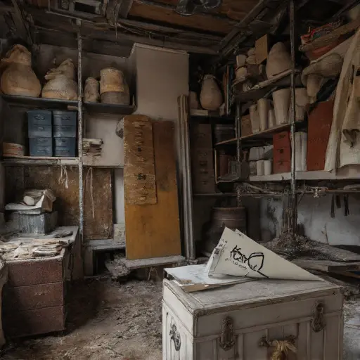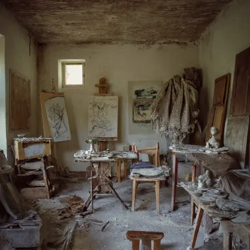 The atelier murmurs with suspended creation. Oils hardened into textures, sketches left incomplete, and brushes abandoned in water jars illustrate routines suddenly broken. Canvases, moldings, and design drafts trace an artist’s exacting workflow, the labor of imagination meticulously structured yet abruptly halted.