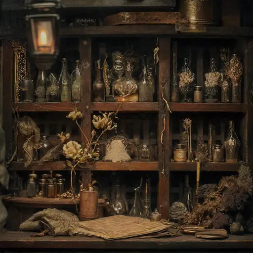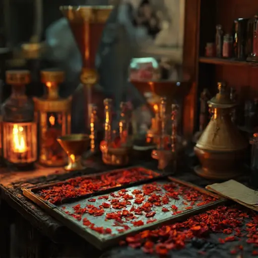 A copper still rests warm to the touch, its spout beaded with cooling condensation. A tray of jasmine petals lies steeped too long, their hue deepened beyond intention. A dropper, stained at the tip, leans against a folded muslin cloth stiff with residue. Even the lantern’s flame shrinks slightly when wind lifts from beneath the door, shadowing a line of vials whose meniscus levels drift unevenly.