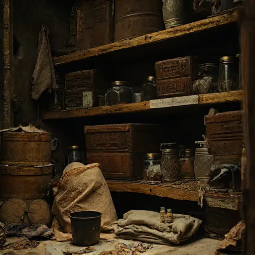 Behind stacked trays rests a returned slip—“inconsistent base.” A trial blend, left uncorked, shows two faintly separating layers. Harish’s stool angles toward the threshold, suggesting he rose often, pacing between attempts to stabilize his approach. A copper ladle sits where he left it, handle warmed by recent use. Thin drips of distillate arc along the tiles, proof of motions paused mid-correction.