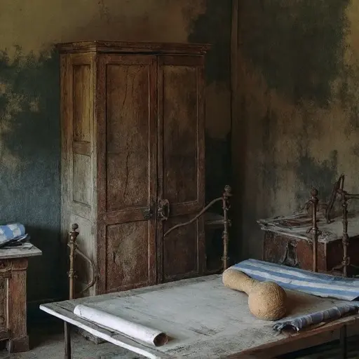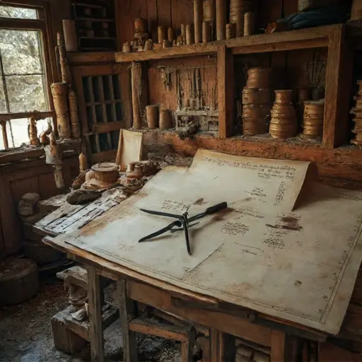 The workshop belonged to Matteo Valenti, master woodcarver and furniture designer, born 1875 in Florence, trained through guild apprenticeship and private study in ornate woodworking. His profession defined the interior entirely: chisels aligned in racks, varnishes arranged by shade, unfinished cabinet panels pinned against walls, and parchment sketches rolled and stacked meticulously. A folded note references his uncle, Lorenzo Valenti, reminding him to prepare new veneers for an upcoming commission. Matteo’s temperament was exacting and patient; ambition expressed through detailed artistry rather than social acclaim. Each day followed precise patterns: measuring, carving, drafting, sanding, and recording dimensions, executed with methodical care and habitual repetition, leaving the room almost ritualistic in its order.