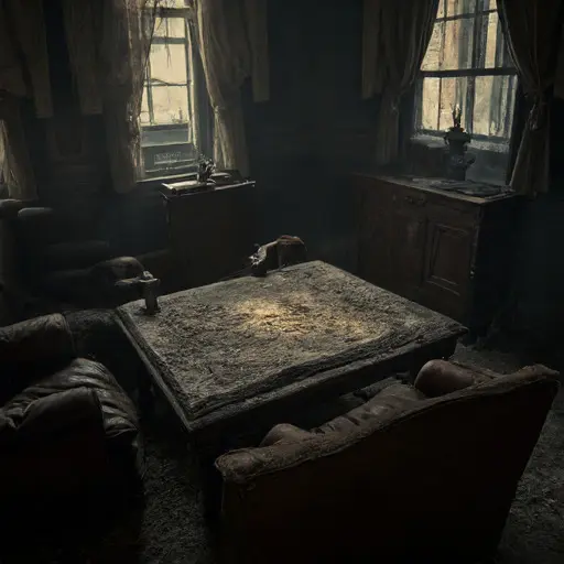 The atmosphere within Harrowmere House was less a cold quiet and more a perpetual suspension of breath. Crossing the threshold into the Reception Hall, one immediately encountered the cold, heavy reality of the forgotten: the air was still, thick with the dry scent of disintegrating fabric and the sharp tang of long-set dust. The grand staircase, with its dark, heavily carved banister, was shrouded in a palpable gloom.