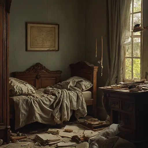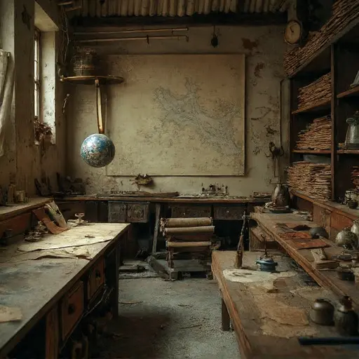 The house remains abandoned, tools and maps frozen mid-creation, preserving the quiet persistence of cartography interrupted, unresolved, and suspended in hushed neglect, a testament to meticulous artistry left unfinished.