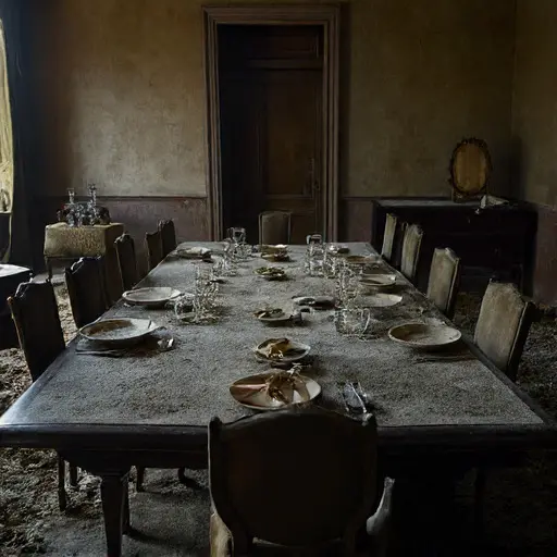 The atmosphere inside the Goldsmith’s Wane is heavy, cold, and intensely motionless, saturated with the dry, coppery scent of old metal and decaying velvet. The Main Entrance Hall is an immediate record of instantaneous abandonment; a massive, gilt-framed mirror on the wall is dull and cracked, reflecting only the overwhelming gloom. A pair of formal, men’s leather gloves rests neatly on a small, marble-topped table near the door, placed with an intention that was never fulfilled.