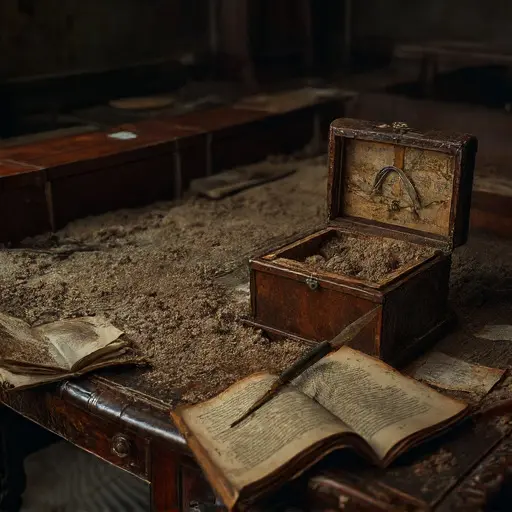 The Butler’s Pantry, a small room adjacent to the Dining Room, holds the most conclusive evidence of the house’s sudden end. On the slate counter, next to rows of tarnished silver trays, rests the unopened final catering bill for the aborted New Year’s Eve ball. It remains wrapped in its original string, addressed to Lucien Fenwick. On the evening of December 31, 1912, as Adeline was preparing for the ball upstairs, Lucien suffered a massive, quiet cerebral hemorrhage in his Study, dying instantly. Adeline discovered the body hours later. Facing financial ruin and unable to bear the public disgrace, she left the house on January 1st, taking only a small valise.