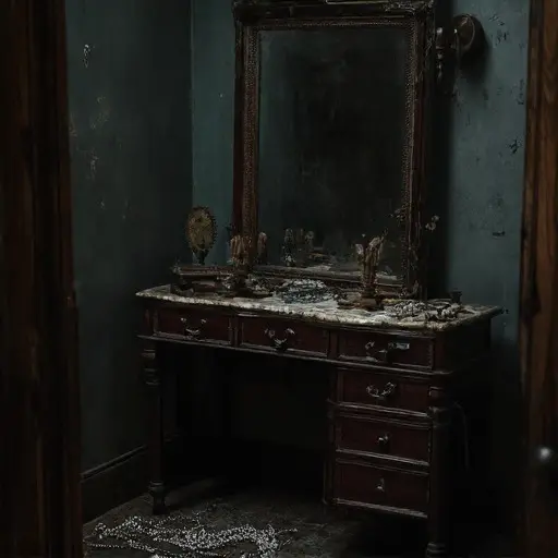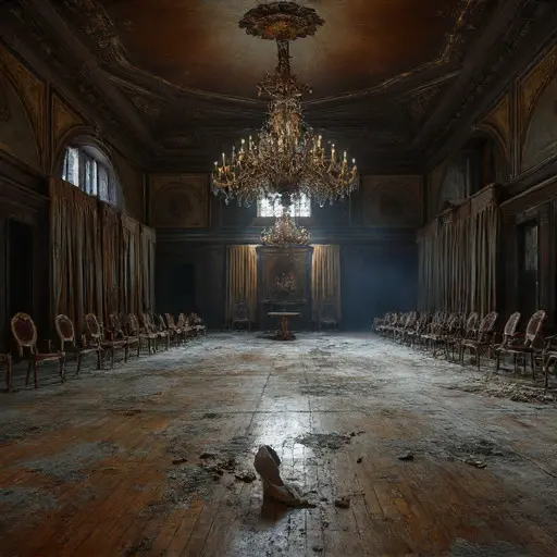 The air inside the Fenwick Glade is a dense, stagnant medium that carries the cold scent of damp stone and decaying silk. It is a house where the sound of one’s own breath feels sacrilegious. The Entrance Foyer is an eloquent testament to the sudden stoppage of life: a heavy oak coat-tree still bears the marks of where multiple hats once rested, and a chipped porcelain vase on a side table holds a cascade of dried, skeletal hydrangea blooms, their blue pigment faded to a pale grey.