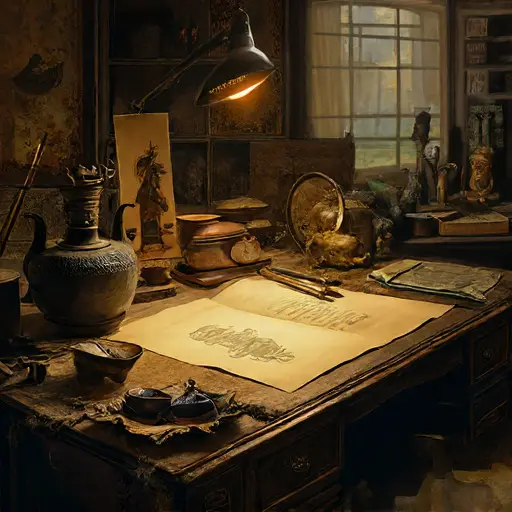On the desk’s corner, a parchment sheet for Western lettering bears faint guidelines drawn too heavily, then scrubbed out, the fibers frayed. Even the bronze crane paperweight leans slightly askew, as though nudged by an uncertain hand retreating from the page. The tension in the room feels delicate, almost apologetic.