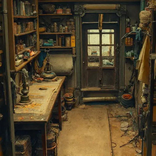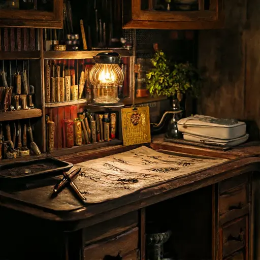 The Calligraphy Room holds a soot-sweet hush, steeped in sumi and paper fibers. Brush cords sway faintly, disturbed by no breeze. The scriptorium desk sits in expectant calm, its blotting cloth stiffened by ink that dried before a final stroke could be set.