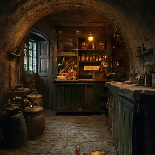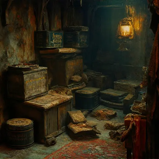 Behind stacked barrels lies a returned note—“incorrect proportion.” A rejected tincture darkens a shallow dish, its surface clouded. Wiktor’s stool angles toward the steps, suggesting restless pacing. A small scoop rests on its side, handle warmed by recent use. A ring of spilled brine curves across the floor, marking each turn of indecision. Even the stone counter shows faint scratches from repeated adjustments.