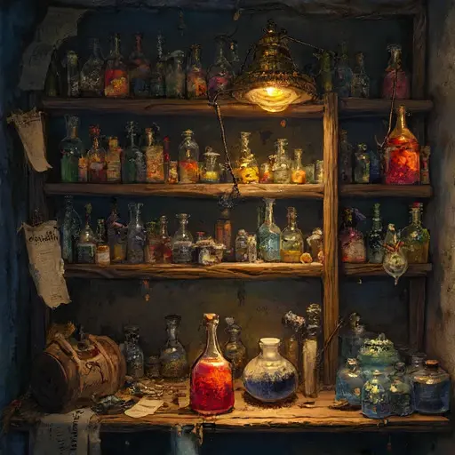 A linen scrap from his sister Irena cushions his finer glassware. Wiktor prepared tinctures at dawn, blended powders by midday, and calibrated measures by lanternlight. His humble background appears in reused corks and Polish-script notes tucked behind brine jars.