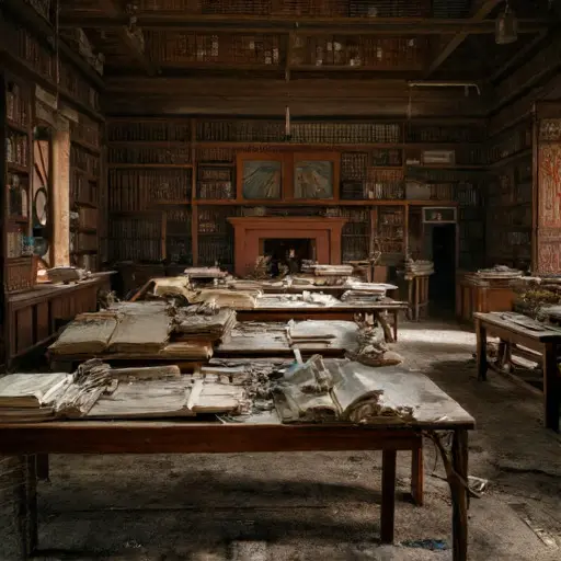 The Bookbinding Hall hums with silent stillness. On a low workbench, penciled notes mark gutter spacing for a commissioned folio, unfinished. Each tool, hide, and book suggests a once-methodical routine suddenly halted, leaving craft frozen mid-motion.