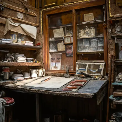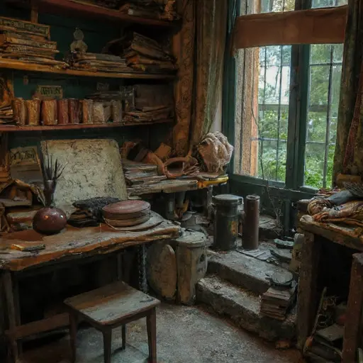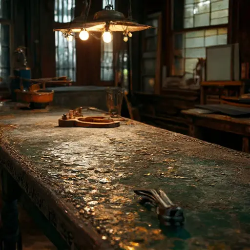 Dust rings trace the absence of tools once arranged with unwavering order. A spool of copper foil slumps across a corner, its end trailing onto the floorboards as if tugged by a moment of indecision. The workshop’s quiet has grown thick, settling on every contour.