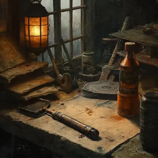 Pinned under a coil of twine is a torn slip: “They insist I falsified the specimen.” Another fragment mutters, “They demand restitution I cannot pay.” The ink of her notes blurs at the edges, perhaps from a damp thumb or from lingering too long in her grasp.