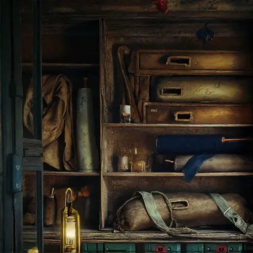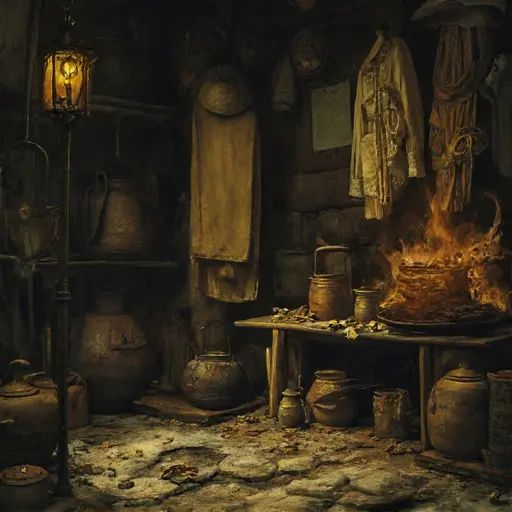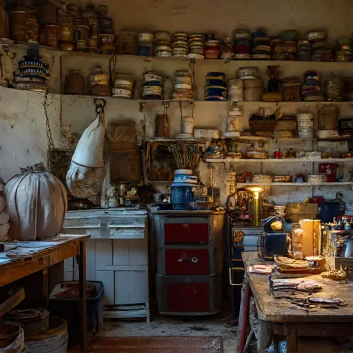 Entering the larder, one senses a soft interruption—air folded around an unfinished brim, the faint scent of damp felt drifting above the stone. The cool walls keep a kind of watchful calm, as though they witnessed a moment of pause rather than departure. No clutter, no overturned stool—only a narrowing quiet that hints something once delicate here slipped off course.