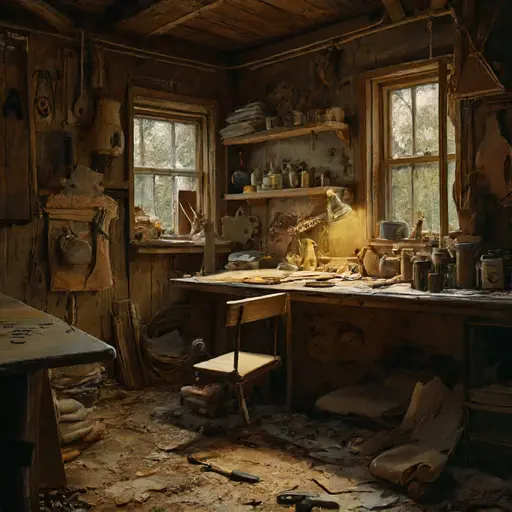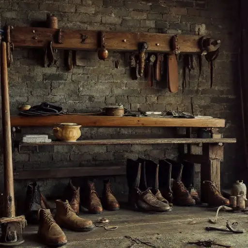 This shoemaker’s bench shelters the world of Patrick Seamus O’Malley, cobbler and bootmaker, born 1872 near Galway. Raised in a modest family of fishermen, he learned to cut and stitch leather under a traveling tradesman who prized neat welts and patient shaping. His sister, Brigid O’Malley, lingers in a small silver brooch pinned to a leather apron hanging by the door.