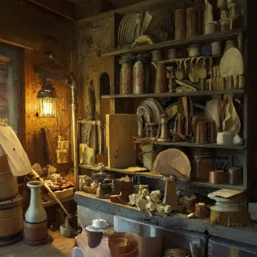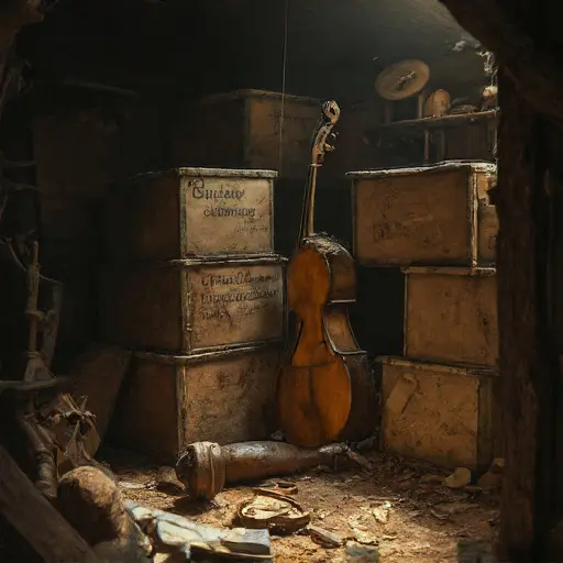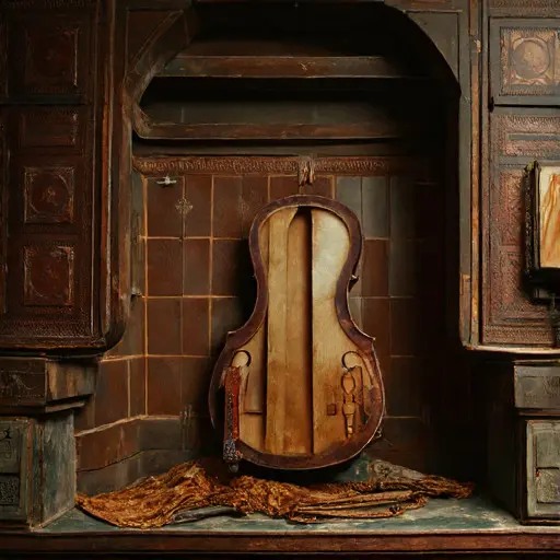 Behind stacked tonewood rests a returned note—“uneven response.” One rib strip lies warped where moisture touched it too long. The stool stands angled toward the alcove entrance, as though Constantin rose repeatedly to gauge the room’s meager light. A caliper, usually exact, shows a faint misreading where the screw drags. Chalk marks on the tiles form soft arcs from slow pacing, each curve uncertain.