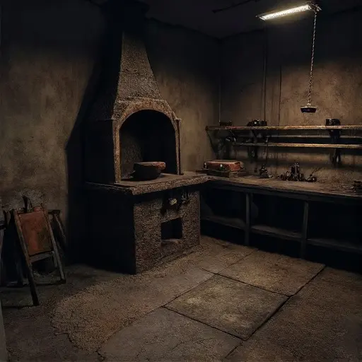 The corner holds a weighty hush, thick with old smoke that seems settled into the bricks. Drafts from the furnace flue sigh through the iron hood. A fractured ladle rests on the floor as if dropped mid-pour.