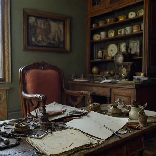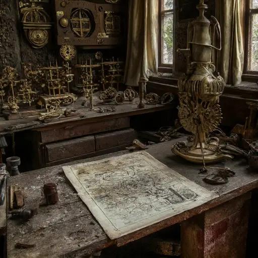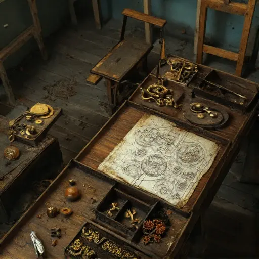 The Clockmaker’s Workshop vibrates with frozen motion. On a table, penciled schematic lines trail off abruptly. Every gear, tool, and magnifying lens embodies meticulous labor abruptly paused, the rhythm of horological work suspended in quiet stillness.