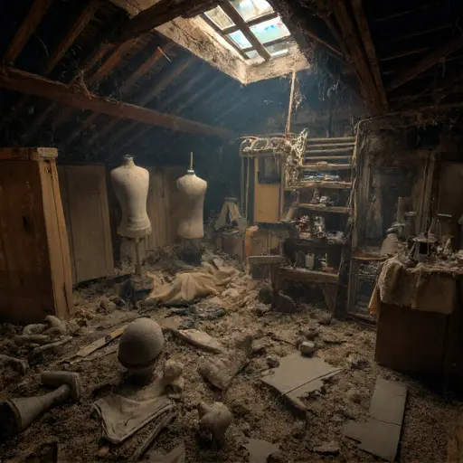 The house remains abandoned, fabrics, tools, and garments awaiting hands that will not return, the quiet heavy with unfinished craftsmanship and lost mastery.