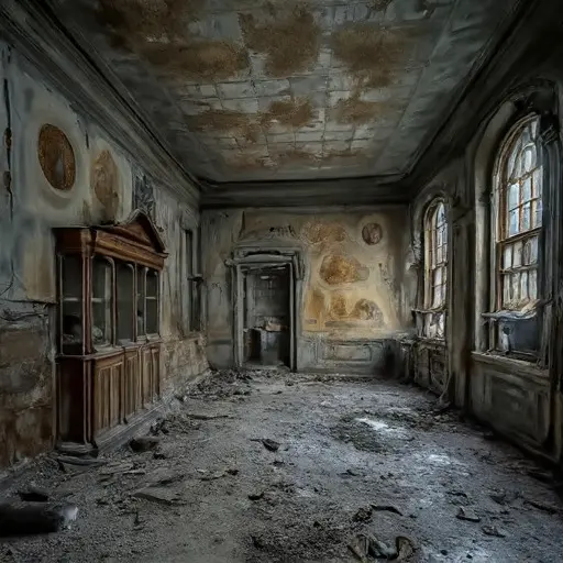 The main drawing-room, a cavernous space meant for formal entertaining, is the epicenter of this chilling silence. The room is in an advanced state of deterioration—dust covers everything, but the underlying structure holds fast, a resolute tomb of memory. The atmosphere is heavy with the truth: this house has been keeping a silent vigil over the remains of a single, devastating internal conflict for nearly a century.