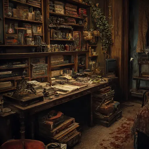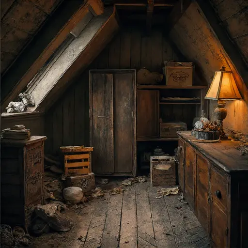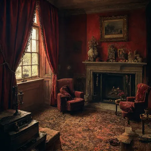 The parlour’s air carries the softened smell of long-dried ink, collapsed upholstery, and the faint mineral hush of dust layered over decades. Nothing feels startled or sudden. Thistlemarrow House seems to have paused gently, as though expecting to resume its routines at dawn—yet dawn never came.