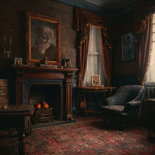 In the Sewing Room, Faranne’s small labors remain frozen. A child’s cuff lies pinned beneath the treadle machine’s presser foot. Thread spools toppled from their careful order have faded into chalk-soft tones. Pincushions hardened by age bristle with rusted needles. Folded muslin stiffened along its edges rests untouched, as if waiting for a return that never came.