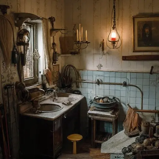 The washroom niche breathes the sharp scent of metal and old ink, each tiled surface echoing the quiet hum of work done under relentless scrutiny. Even the lantern’s glow seems resigned, as though dimmed by the tension held in the half-finished lines.
