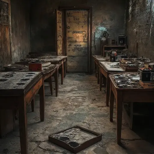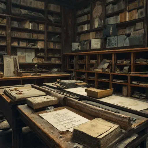 Benches display partially etched plates and scattered sketches. Burins, scrapers, and ink brushes lie stiff with dried pigment. Inking pads and polishing cloths sit nearby. Giovanni’s ledger, tucked beneath a weighted sheet, lists client names, plate dimensions, and deadlines. Dust settling over tools and plates emphasizes the sudden cessation of precise, repetitive gestures.