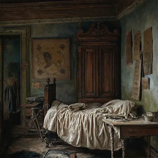 The house remains abandoned, plates, tools, and sketches awaiting hands that will not return, the quiet heavy with unfinished precision and lost mastery.