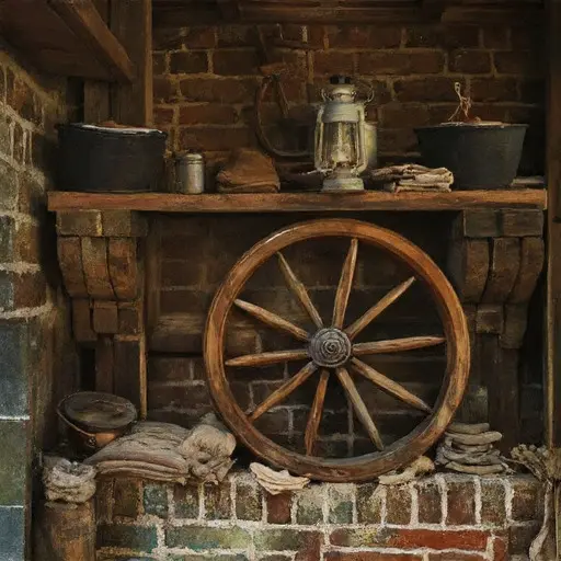 A soft linen scrap from his sister Dagmar cushions his spoke shaves. Niels carved hubs at dawn, trimmed spokes by midday, and fitted rims under a warm lantern glow. His humble upbringing lingers in reused molds, re-wedged handles, and Danish-script slips tucked behind flour tins.