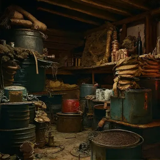 The hearth-step pantry holds a mingled scent of ash, pine shavings, and cooling iron. Lanternlight creeps across tools arranged in a discipline that trembles with doubt, each object carrying the hush of a motion paused too abruptly.