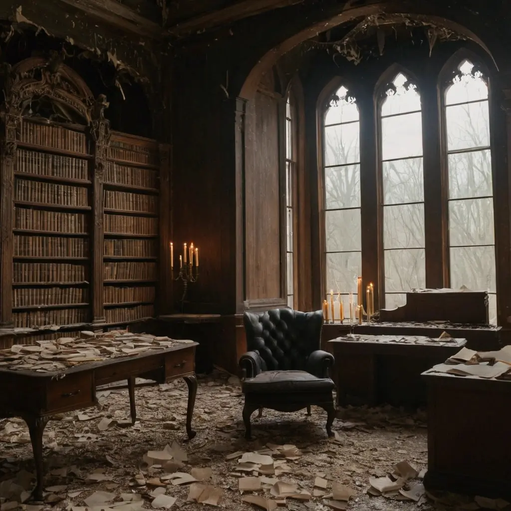 Beyond the ballroom lies a library untouched for decades. The scent of old paper fills the air — dry, brittle, and strangely comforting. Rows of books lean against each other for support, their spines faded, their secrets waiting for someone brave enough to open them. Candlesticks stand on an enormous desk, their wax melted into ghostly puddles.