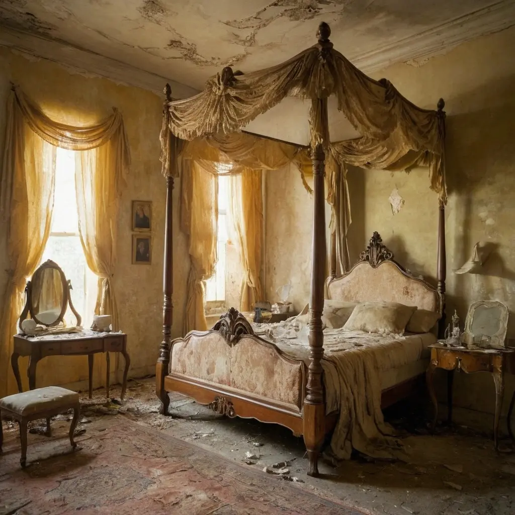 Exploring deeper into the mansion reveals a series of forgotten rooms, each with its own eerie personality. Some are almost beautiful in their ruin — the delicate remnants of lace curtains, the intricate carvings on the bedposts, the soft decay of once-elegant wallpaper.
