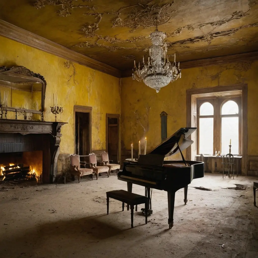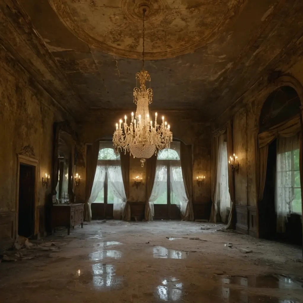 - Faded opulence: Chandeliers with missing crystals still sparkle faintly in the gloom.