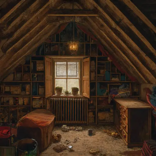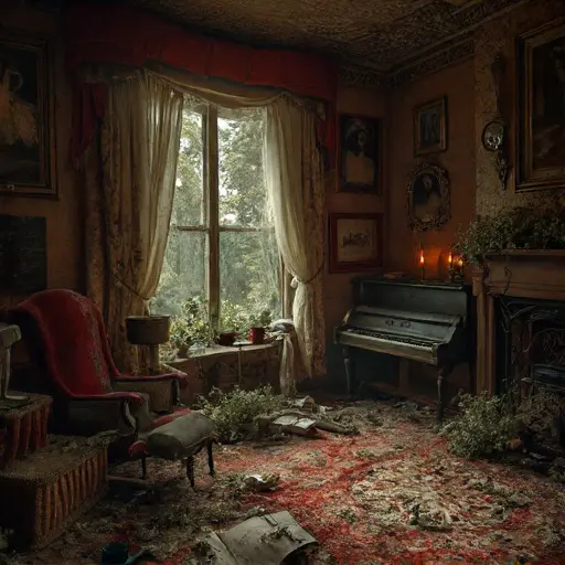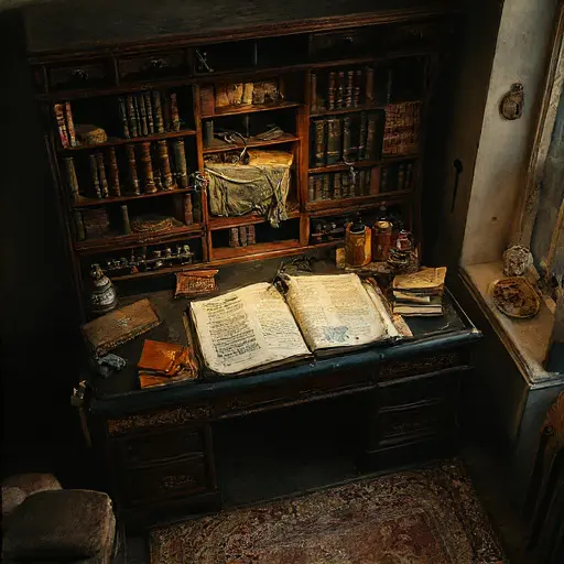 The parlour’s air carries the softened scent of dried ink, old fabric, and the subtle mineral quiet of long-settled dust. Nothing feels abrupt. Wynthorlen House appears to have paused on a routine day, its inhabitants expecting to return at any moment.